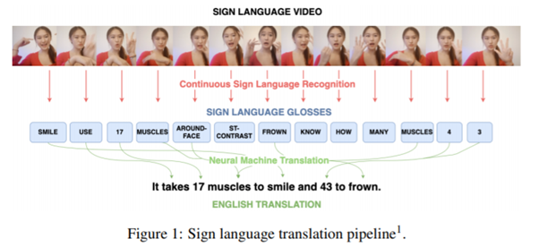 SLT 시스템은 입력 비디오를 gloss로 토큰화하는 첫번째 단계로 CSLR을 취함. 그 다음 추가단계는 gloss를 대상 언어에서 유효한 문장으로 번역. SLT 는 다른 번역문제와 비교해서 새롭고 어려운데, 그 이유는다중 큐 언어의 비디오에서 의미 있는 기능을 정확하게 추출한 다음 소스 언어에서 직접 번역하는 대신 중간 광택 표현에서 번역을 생성하는 두 단계가 포함되기 때문.