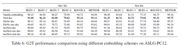 표 5는 새로운 임베딩 방식이 PHOENIX-Weather 2014T에서 성능을 향상시키지 않는다는 것을 보여줌. 따라서 PHOENIX-Weather 2014T에 대한 실험을 위해 단어 임베딩의 무작위 초기화를 유지. GloVe 및 fastText 영어 벡터는 모두 ASL 용어의 어휘 및 영어 대상과 합당하게 겹침(표 4). 따라서 ASLG-PC12에서는 인코더와 디코더 모두뿐만 아니라 디코더에만 사전 훈련된 임베딩을 로드함.