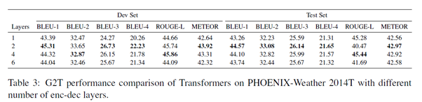 최상의 모델을 선택하기 위해 현재 MT에서 가장 널리 사용되는 메트릭인 BLEU-4를 주로 고려. 표 3은 PHOENIX-Weather 2014T에서 2개의 레이어를 사용하여 가장 높은 BLEU-4를 얻음. 데이터 세트는 음성 언어 데이터 세트보다 훨씬 작기 때문에 더 큰 네트워크는 불리할 수 있고, 또한 모델이 작을수록 메모리와 계산 시간을 덜 차지한다는 장점이 있다.
