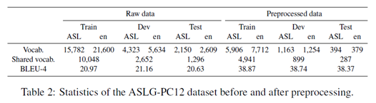 - ASLG-PC12의 경우 많은 ASL 용어가 접두사가 추가된 영어 단어이므로 데이터 사전 처리 중에 이러한 접두사를 모두 제거합니다. 또한 훈련 중 5회 미만으로 나오는 모든 글로스를 <unk>키로 설정하여 어휘 크기를 줄임.