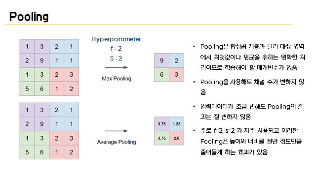 이게 최대 풀링의 흥미로운 점인데 f와 s가 이렇게 고정된 값이라서 학습할 수 있는 변수가 없다는 것이다. 주로 f=2, s=2가 자주 사용이 되는데, 이러한 풀링은 높이와 너비를 절반 정도만큼줄어들게 하는 효과가 있고, 아까 필터는 6x6x3을 3x3x3필터를 이용해서 콘벌루션을 하면 4x4의결과가 나왔는데 풀링은 output과 input의 채널 수가 변화하지 않는다는 특징이 있다.