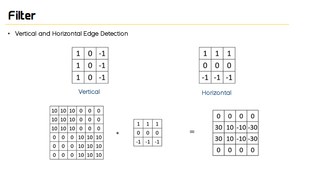 이외에도 수평 엣지를 찾아내는 horizontal 필터, 그림에는 넣지 않았지만 대각선 방향의 경계 검출에 강한 소벨 필터 등 윤곽선 탐지를 위해 사람들이 연구한 여러가지의 필터들이 존재한다. Horizontal이라고 쓰여진 필터는 바로 수평 경계를 찾아내는 horizontal filter 가 된다.