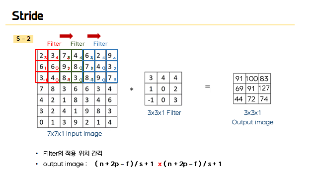 다음으로 살펴볼 용어는 stride다. 지금까지는 filter를 input image에 적용할 때 한 칸씩 옆으로 이동을 하면서, output의 값을 계산을 해주었는데, stride는 바로 이 filter가 한번 움직일 때 얼만큼 움직일 것인가를 정해주는 값이 된다.