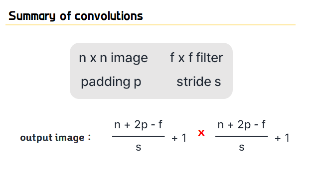 그래서 지금까지 나온 용어들을 정리해보면 nxn의 image에 p만큼의 padding을 해주고 fxf 크기의 filter를 이용해서 s만큼의 stride를 통해 output이미지의 크기를 계산해주면 다음과 같은 공식이 나오게 된다.