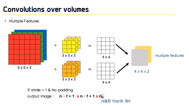 그런데 이때 우리가 만약 세로 윤곽선만 찾고 싶은 것이 아니라 세로와 가로 윤곽선 모두 또는, 45도 혹은 70도 기울어진 윤곽선을 찾고싶을 수도 있는데, 다시 말해서 여러 개의 feature들을 동시에 추출하고 싶을 수 있다. 그럴 때는 이제 filter를 여러 개 이용을 하게 되는데, 즉 여기서는 예를 들어 노란색 필터가 vertical edge 주황색 필터가 horizontal edge를 감지하는 필터라고 하면, 이렇게 각각의 노란색 주황색 필터와 input image를 convolution을 해주고 그렇게 해서 나온 이 4x4의 output image들에서 첫번째이 output을 앞쪽에 두고, 두번째 필터의 결과를 그 뒤에 놓는다. 그래서 두개를 쌓게 되면 최종적으로 4x4x2 크기의 결과를 얻게 된다.