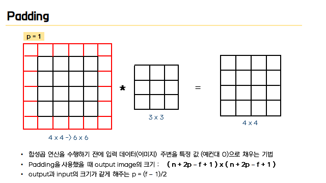 이러한 문제점을 해결하기 위해 사용하는 것이 바로 padding이다. 패딩이란, 합성곱 연산을 수행하기 전에 입력데이터 즉 이미지의 주변을 (주로 0을 많이 사용하는데) 특정값으로 채우는 기법이다. 위에 보이는 예시가 바로 padding을 1로 했을 때의 input이미지로, 기존에 4x4였던 input size가 이렇게 주위에 한겹의 padding을 해줌으로써 6x6의 크기로 바뀌게 되고, 이때p=1이라는 값을 아래 공식에 넣어주게 되면 4 + 2 – 3 +1로 output이 기존 input크기와 동일한4x4가 되는 것을 볼 수가 있다. 이때 output과 input의 크기를 같게해주는 p는 n+2p-f+1 = n 이라는 공식을 통해 (f-1)/2라는 값이 된다.