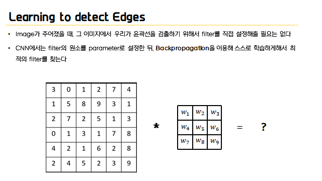 방금 살펴본 것과 같이 다양한 필터들이 존재하지만, 우리는 어떤 이미지가 주어졌을 때, 그 이미지에서 윤곽선을 검출하기 위해서 filter를 직접 설정해줄 필요는 없다. 우리는 이 filter의 원소 여기서는 3x3 필터이기 때문에 총 9개의 원소를 파라미터로 설정을 해준 뒤 backpropagation을 이용해서 스스로 학습해 나가면서 최적의 filter를 찾아 나가도록 하면 된다!!