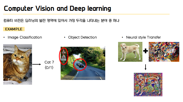본격적인 내용에 들어가기에 앞서서 이제 이 CNN 이 어떻게 등장하게 되었는지 , 간단히 컴퓨터 비전을 통해서 한번 살펴보자. 이 컴퓨터 비전은 말그대로 컴퓨터가 사진이나 영상을 즉 이 미지 이용을 해서 하는 모든 것들을 일컫는 말이고 최근 딥러닝의 발전 영역에 있어서 가장 두각 을 나타내는 그러한 분야 중에 하나다.