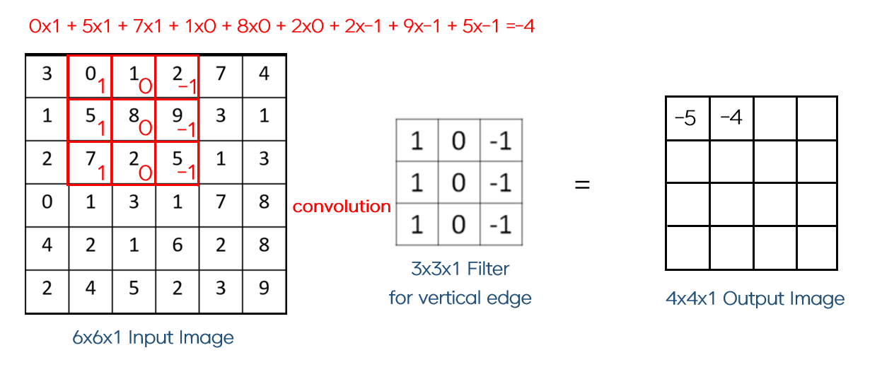 이제 다음과 같이 필터를 한칸 옆으로 옮기게 되고 같은 과정을 반복해 주면 output image에서 두번째 원소는 이렇게 -4가 되고 이런식으로 같은 방법으로 필터를 한칸씩 옮기며 반복해서 계산을 해준다.
