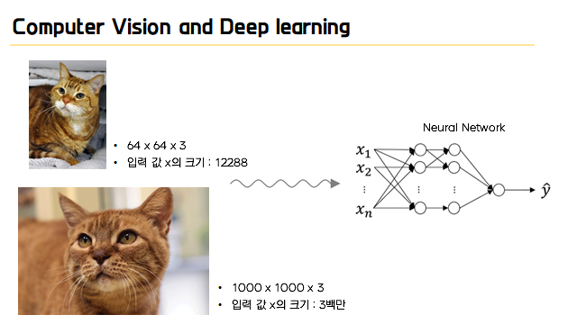 예를 들어 위와 같이 64 x 64 x 3 의 이미지가 있다면 입력값 x 는 12288 의 크기를 가지게 되는데, 이것은 굉장히 작은 사진이기 때문에 큰 문제가 되지는 않지만 만약 아래와 같이 다루게 되는 이미지가 더 큰 이미지가 된다면 즉 예를 들어 1000x 1000 x 3 의 크기라면 입력 크기 x 가 3 백만이 라는 매우 큰 수가 되고 여기 들어가는 x 는 3 백만의 차원을 가지게 된다.