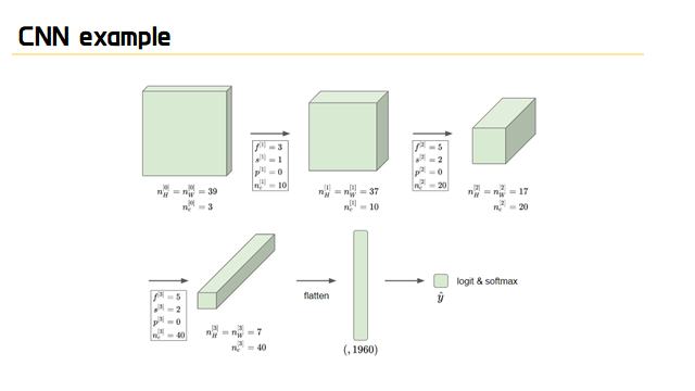 이제 그럼 합성곱 신경망의 단일 합성곱 층의 구성요소를 이용해서 한번 심층 합성곱 신경망의흐름을 한번 살펴보자. 여기 []꺽쇠안에 들어가는 수는 layer를 의미를 하며 보는 것과 같이 높이와 너비가 39, 채널의수가 3인 input이미지가 들어왔다. 이때 3x3x3의 필터 10개를 stride=0으로padding=0으로 convolution을 거치면 다음과 같이 높이와 너비가 37이고 채널의 수가 10인output이 나오게 되고, 이런식으로 3번의 convolution을 거치면 높이와 너비가 7이고 채널수가40인 output이 되는데, 특징을 살펴보면 신경망이 깊어질수록 높이와 너비가 비슷하게 유지되다가 깊어질수록 줄어들고 대신 채널의 수는 늘어나게 되는 것을 볼 수 있다.