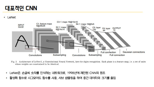 우선 하나는 CNN의 원조인 LeNet이다. 이 LeNet은손글씨 숫자를 인식하는 네트워크로, 1998년에 제안이 되었다. 여기 보이는 그림에서처럼 합성곱 계층과 단순히 원소를 줄여주는 역할을 하는 서브 샘프링 계층을 반복적으로 사용하고 마지막으로 완전연결계층을 거치면서 결과를 출력한다. 이 LeNet은 현재의 cnn과 비교하면 몇가지면에서 차이가 있는데 우선 활성화 함수다. LeNet은 활성화함수에 시그모이드 함수를 사용하는데 반해, 현재는 주로 ReLU를 이용한다. 또한 LeNET은 서브샘플링을 해서 중간 데이터의 크기를 줄이지만 현재는 오늘 살펴본 MAX POOLING이 주류다.