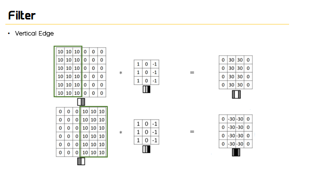 이렇게 filter가 가장 아래의 마지막까지 움직여서 output이미지의 원소를 모두 채워주게 되고 이 값이 바로 output image가 된다. 이때 우리는 vertical edge를 감지해내는 필터를 이용했기 때문에 output image는 input image의 수직 엣지라는 특성을 추출한 이미지가 된다.
