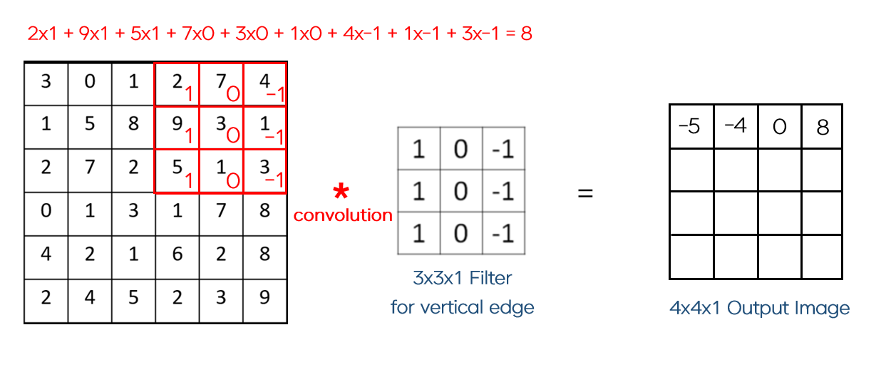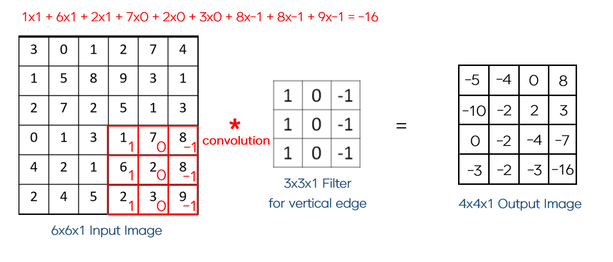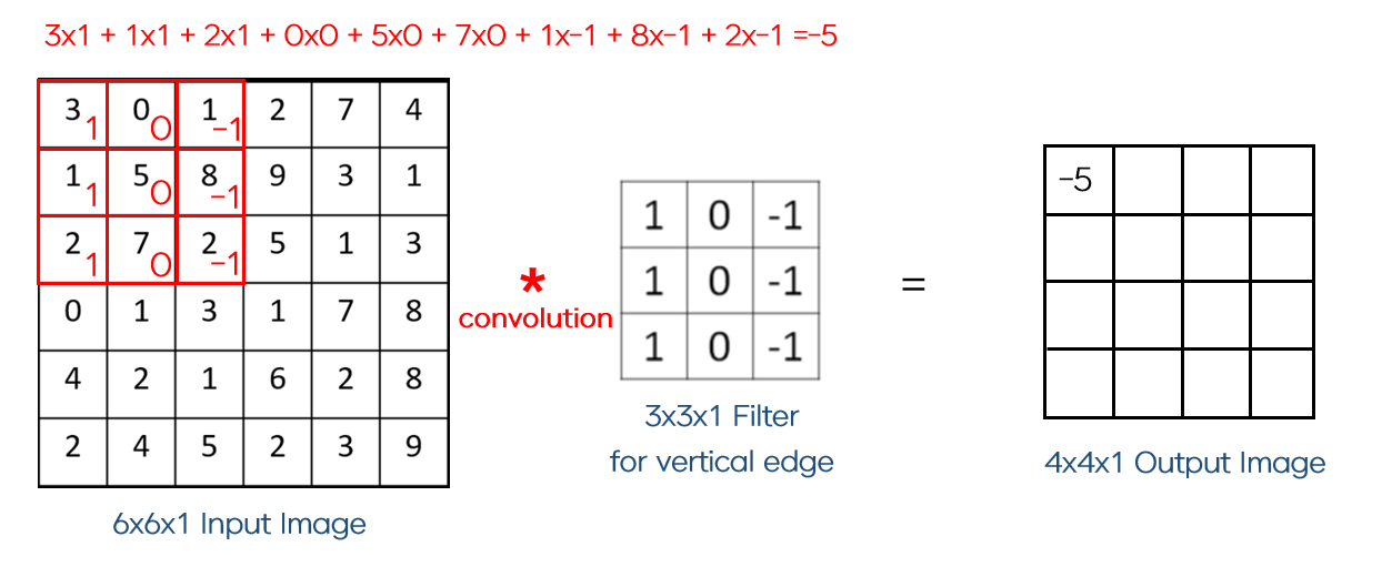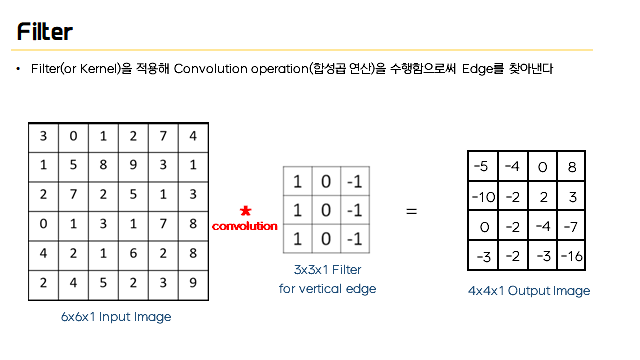 이러한 Edge를 찾아내는 역할을 하는게 바로 Filter이다. (Filter는 kernel이라고 불리기도 하는데 일단 여기서는 filter라는 단어를 사용) 이제 이 filter가 어떻게 엣지를 감지를 해내냐 하면은 바로 convolution operation 즉 합성곱 연산을 수행함으로써 엣지들을 찾아내게 된다. 예시를 통해서 이 과정이 어떻게 이루어지는지 살펴보자. 우선 이미지의 왼쪽에 위치한 6x6의 이미지가 input이미지로 이때 이미지는 gray scale이라고 가정을 해서 rgb값은 1이 된다. 이때 이 input이미지의 vertical edge즉 수직 엣지를 찾아내주는 필터가 가운데에 보이는 이 3x3 크기의 필터다. 이제 이 3x3 filter가 input image와 합성곱 연산을 수행하면서 4x4 크기의 out put이미지를 내게 되는데요 이 합성곱 연산은 다음과 같이 이루어 진다.