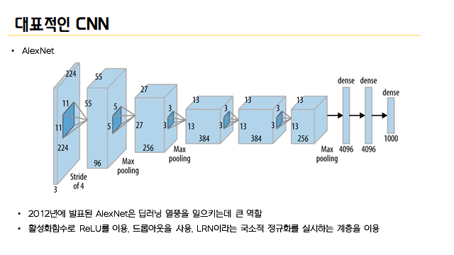 다음으로 2012년에 발표된 알렉스 넷인데, 이 알렉스 넷은 딥러닝 열풍을 일으키는 데 큰역할을 했다. 그림을 보시면 그 구성은 기본적으로 LeNET과 크게 다르지 않다. 하지만활성화 함수로 relu를 이용한다는 점, LRN이라 Local Response Normalization 즉 국소적 정규화라는 것을 실시하는 계층을 이용한다는점, 드롭아웃을 사용한다는 점에서 LEnet과 다른점들을 가지고 있다.