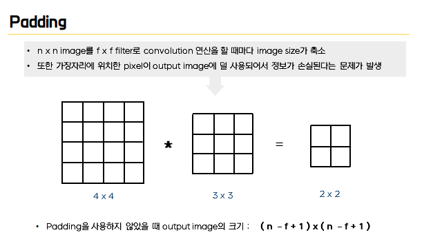 또한 convolution 연산 특성상, 가장자리에 위치한 pixel들은 output의 원소를 계산할 때 덜사용되기 때문에, 가장자리의 정보가 손실된다는 문제점이 있다.