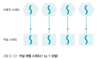 - [단점] 여러 개의 스레드가 하나의 커널 스레드와 연결되어 커널 스레드가 입출력 작접을 위해 대기 상태에 들어가면 모든 사용자 스레드가 같이 대기해야하며, 한 프로세스의 타임 슬라이스를 여러 슬레드가 공유해 여러개의 CPU를 동시에 사용할 수 X. 또한 보안에 취약하다는 단점도 있음