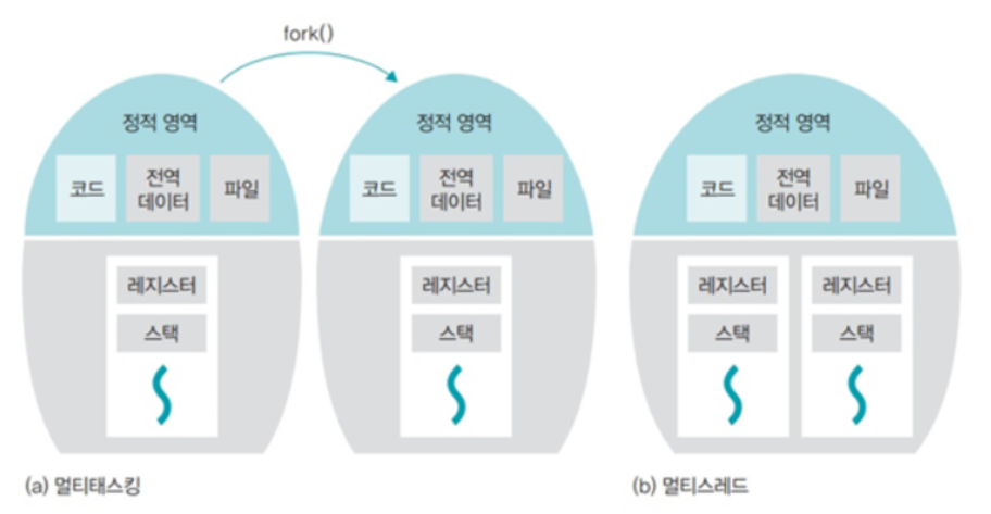 스레드는 이러한 멀티태스킹의 낭비요소를 제거하기 위해 사용하며, 비슷한 일을 하는 2개의 프로세스를 만드는 대신 코드, 데이터 등을 공유하면서 여러 개의 일을 하나의 프로세스 내에서 함