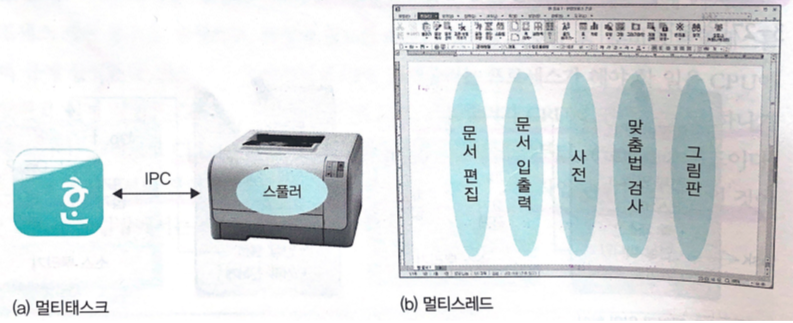 워드 프로세서 프로세스 내의 문서 편집/입출력/맞춤법 검사/그림판 같은 스레드들이 동시에 작업을 하는 멀티스레드. 멀티스레드는 변수나 파일 등을 공유하고 전역 변수나 함수 호출 등의 방법으로 스레드 간 통신 을 함.