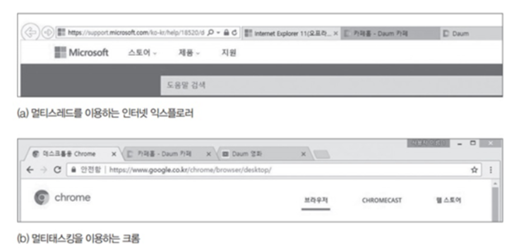 -> 인터넷 익스플로러 프로세스는 하나의 프로세스에 멀티스레드를 사용하고 크롬은 여러개의 프로세스를 사용. 따라서 서 여러개의 화면 중 하나에 문제가 생겼을 때, 그 문제가 있는 화면을 강제 종료하면 인터넷 익스플로러의 경우 전체가 종료되지만, 크롬은 다른 화면에 미치는 영향이 작음