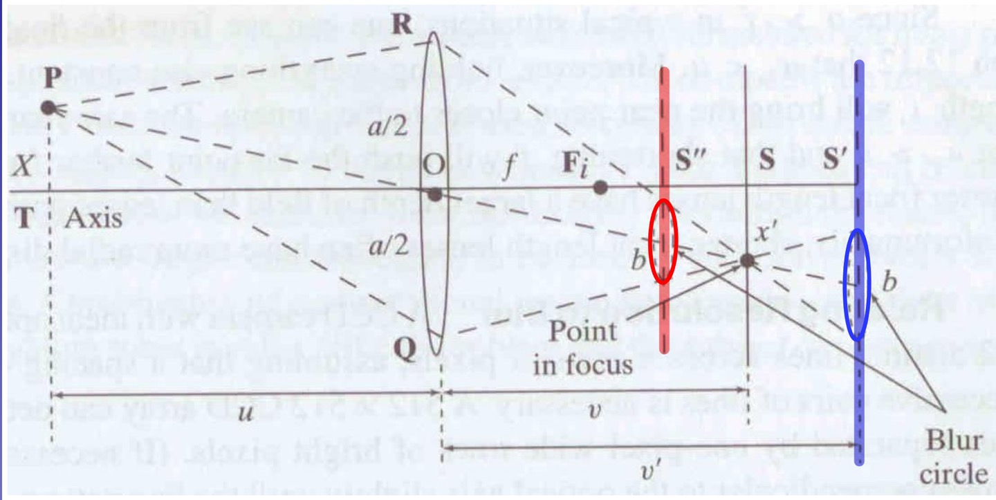 따라서 blur가 발생하지 않게 하기 위해서는 그림에서 x'라고 표시된 point in focus 근처에 image plane이 위치해 있어야한다는 것이다.