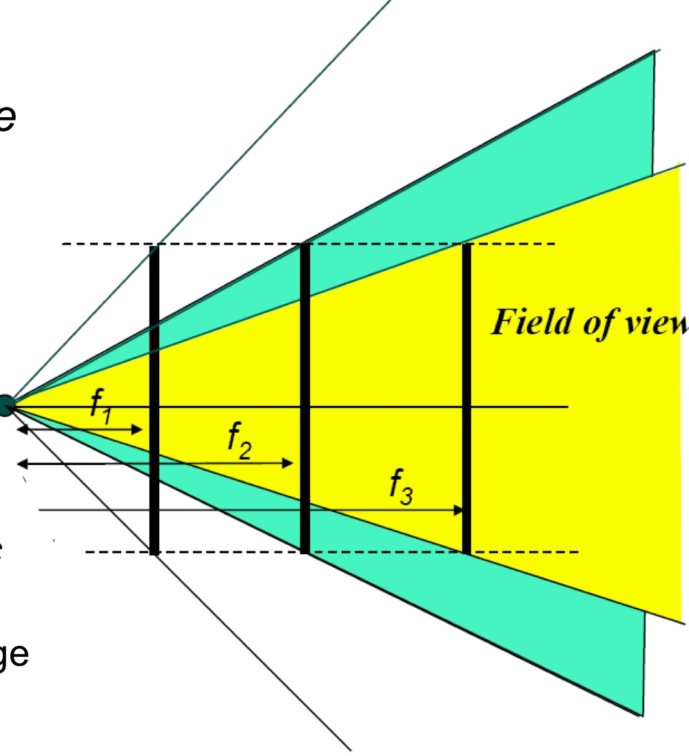 위의 그림을 살펴보면 focal length가 매우 작은 f1의 경우, image plane이 camera center와 매우 가까워지게 되고 이와 상응하게 wide한 field of view를 가지게 된다.