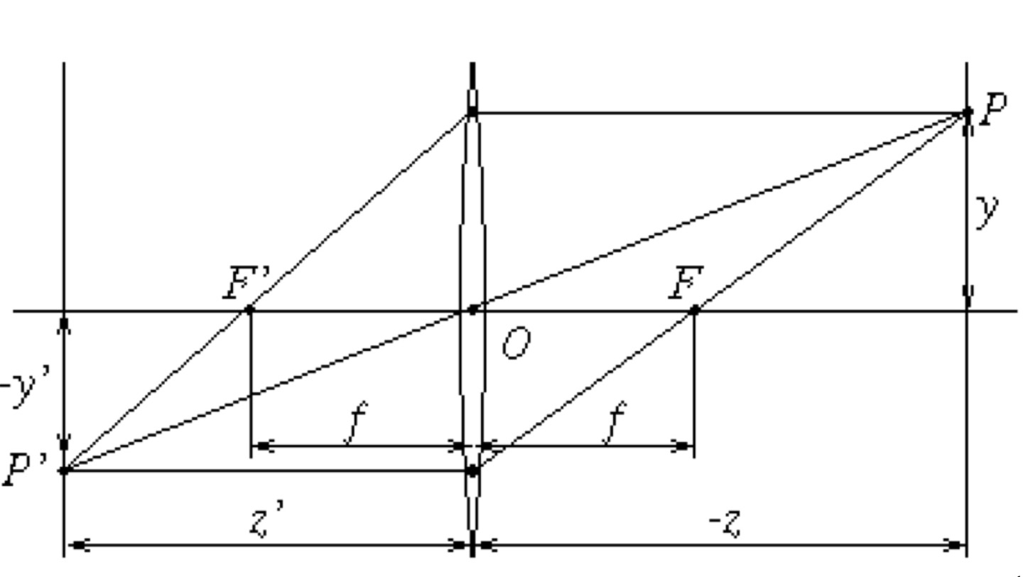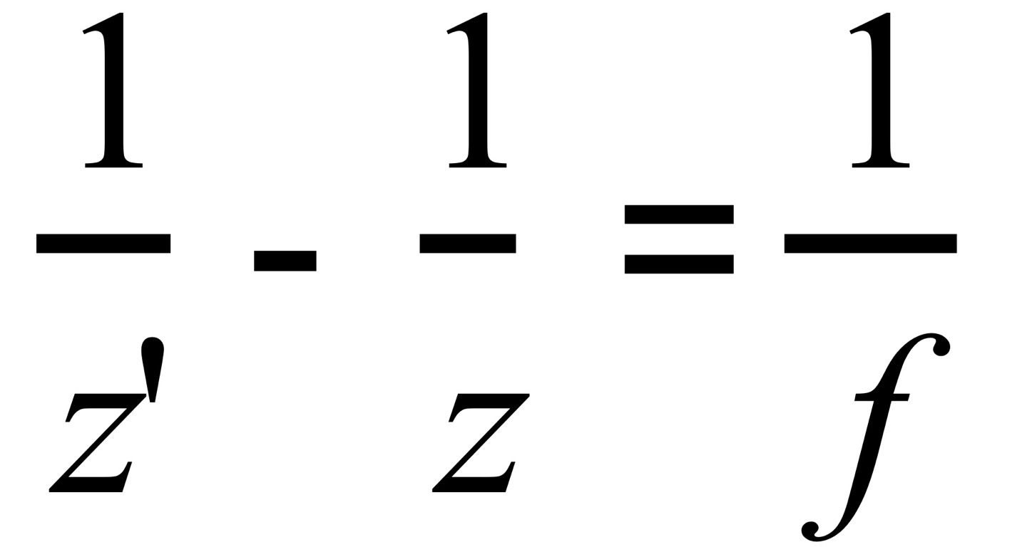 이러한 광선 추적에 의해, 물체 거리 -Z와 이미지 평면까지의 거리 Z' 사이의 관계는 다음과 같이 보일 수 있다.