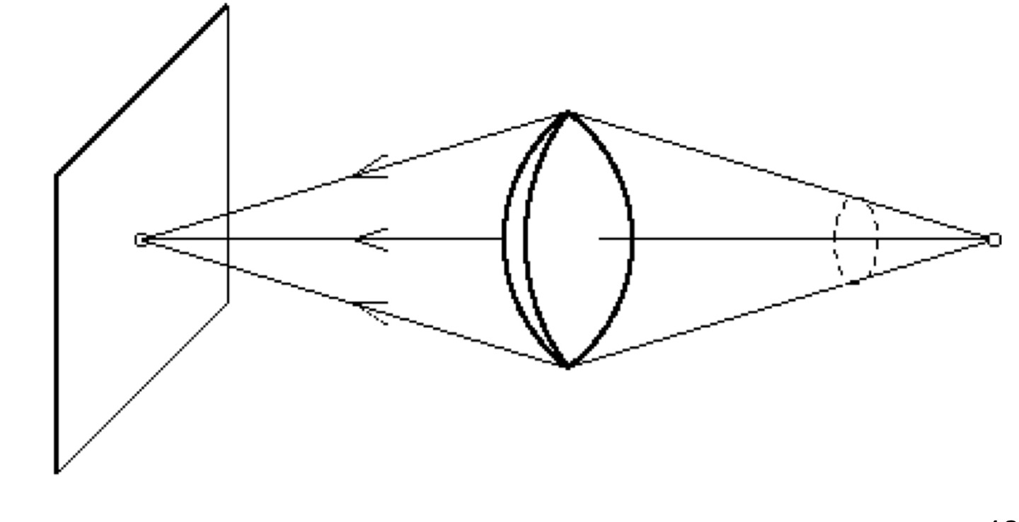 즉, 모든 빛이 lens를 지나 굴절하게 되어 image plane의 하나의 점으로 모이게 된다. 이렇게 되면 image는 sharp하게 유지하면서 빛은 큰 area로부터 모을 수 있기 때문에 사진의 밝기도 유지할 수 있게 되고 따라서 lens는 pinhole을 대안할 수 있는 방안이 된다.
