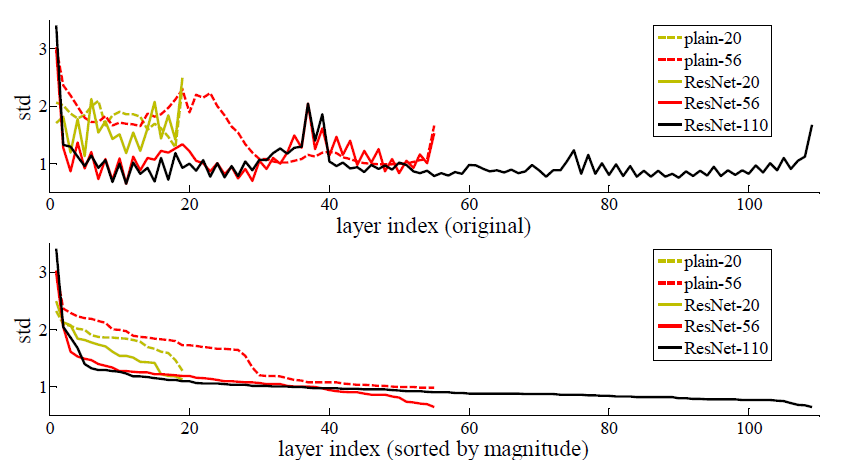 - 기본적으로 resnet같은 경우는 상대적으로 작은 response값을 보인다. 값이 0에 가까운 형태로 optimization이 이루어 졌다고 판단. 또한 layer가 너무 불필요한 수준으로 깊어지면 오히려 성능이 떨어질 수 있다. 그래서 작은 데이터에 대해서 불필요하게 너무 깊은 layer를 쌓게 되면 overfitting문제가 발생해 성능이 떨어질 수 있다.