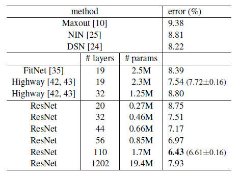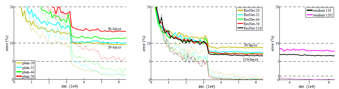 이와같이 기본적인 cnn에서 layer의 수만 늘리는 것은 이처럼 training, test error를 둘다 증가시키는 것을 확인할 수 있다.