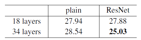 - 위 그래프를 확인해보면 기존 plain network에서 더 깊은 layer를 쌓는 것은 오히려 더 얕은 네트워크보다 에러율이 높아진 것을 확인할 수 있다.