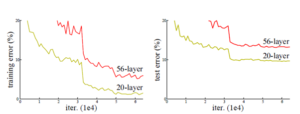 (단순히 layer를 깊게 쌓는 것은 오히려 training error를 높이는 문제를 발생시킬 수 있다, 만약 overfitting 문제였다면 training error는 낮아졌을 것이다.)