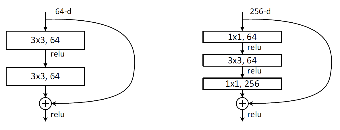 Bottleneck을 그림을 통해 확인해보면 초반에 1x1짜리 filter를 64개 사용, 중간에는 일반 residual block과 마찬가지로 3x3짜리 filter사용, 마지막에 다시 1x1짜리 filter를 256개 사용.