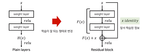 -여기서 방금 말한 이 weight값을 여러 번 거친 결괏값을 F라고 한다. 즉 F(x)에 x를 더한 형태가 우리가 의도했던 형태인 H(x)와 같아지는 형태가 되도록 유도함. 이렇게 되면 앞선 layer에서 학습된 정보(이전 단계에서 뽑았던 특성들)인 단순한 특성 x는 변형없이 그대로 가져올 수 있게되고 거기에 뒷부분에서 뽑은 복잡한 특성, 즉 추가적으로 남아있는 잔여한 정보인 F를 더해주겠다는 것이다. 즉, F만 추가적으로 학습을 해주면 되기 때문에 F+x전체를 학습하는 것보다 쉽다.