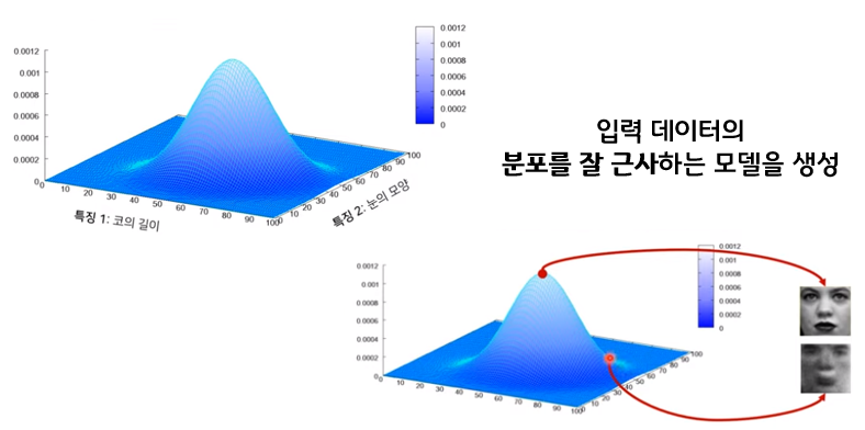 Generative model은 어떤 데이터, 예를 들어 이미지 데이터가 들어오면, 그 이미지에서의 다양한 특징들이 각각의 확률 변수가 되는 어떤 확률 분포를 만들게 된다. 예를들어 위의 예시에서는 어떤 인간의 얼굴 데이터가 들어오고 우리가 hidden layer에서 dimension을 2라고 설정했다면, 이렇게 코의 길이 , 눈의 모양과 같이 두개의 특징에 대한 값들이 catch가 되고, 그 두가지 특징들에 대한 확률 분포를 표현한다면 결합 확률 분포 형태로 나타나게 된다.