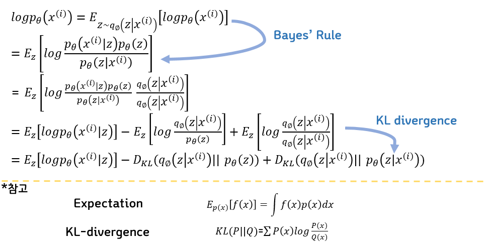그럼 이제 encoder의 도움을 받아서 어떻게 학습을 시키는지 수식의 유도과정을 간단히 살펴보자. 먼저 우리의 목표는 data likelihood인 이 p(X)를 최대화 시키고 싶은 것이기 때문에, 이 값에 log를 먼저 씌워준다. 그리고 그것을 expectation 즉 기댓값 형태로 나타내게 되는데, 이때 log p(X)는 그대로 두고 z가 encoder를 거쳐서 나오는 확률 분포를 따를때의 기댓값으로 이렇게 표현하게 된다. 그리고 이제 베이즈 공식을 사용해서 p(x)값을 변형해서 표현해준다. 이제 동일하게 q(z|x)를 분모분자에 동일하게 곱해주고 앞에 log가 씌워져있기 때문에 log안의 분수를 이와 같이 덧셈과 뺄셈으로 풀어주게 되면, 여기서 이제 두가지 개념으로 최종식을 완성시켜주게 된다.