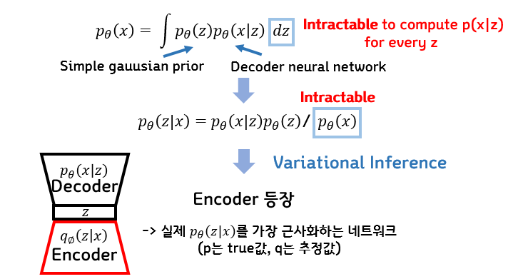 그런데 모든 z에 대해서 p(x|z)를 모든 z에 대해서 적분을 하는 것이 intractable하기 때문에 결국 계산이 불가능하다. 그래서 그럼 베이즈 공식을 통해 식을 변형해 보기도 하지만, 결국 살펴봐도 식에 우리가 모르는 값인 p(x)가 있기 때문에 계산을 할 수가 없게 된다.