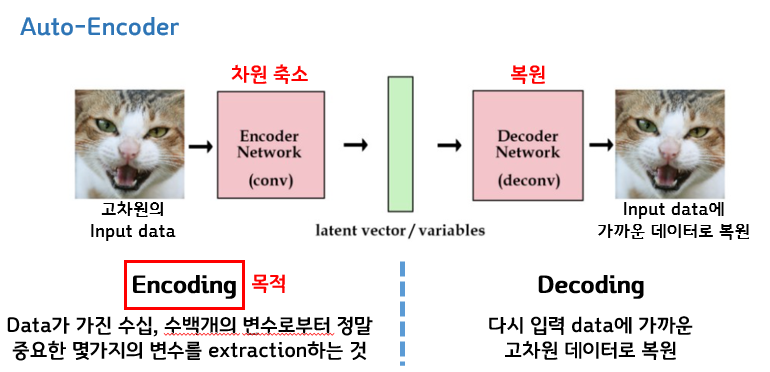 어떤 input이 들어오면 인코더에서는 차원축소가 일어나고, 축소된 z가 decoder로 들어가면 다시 input형태로 복원된 output이 나오게 된다. 이때 이 오토인코더의 목적은 차원축소이기 때문에 왼쪽의 인코더를 학습하기 위해서 디코더는 그냥 따라붙은 그러한 형태라고 생각할 수 있다.