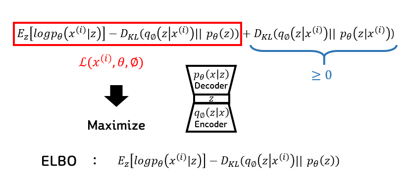 이렇게 최종 식만 가져와서 다시 살펴보도록 하자. 결국 우리의 목표는 이 최종식을 maximize하면 되는 것인데 여기서도 우리가 계산할 수 없는 하나의 값이 존재한다 바로 p(z|x)값 인데, 여기서 p는 true값이고 q는 우리가 모르는 p(z|x)를 추정하기 위한 추정값이 되기 때문에 따라서 x가 주어졌을 때 z의 true값은 우리가 계산할 수 없다. 하지만 우리는 얘가 KL divergence라는 것을 알고, 앞에서도 말했듯이 두 확률 분포의 차이를 계산하는 이러한 함수이기 때문에 항상 0보다 크거나 같다라는 정도는 우리가 알수있게 되고, 그럼 이부분이 0보다 크거나 같다면 이 앞의 부분을 LOWER BOUND로 해서 maximization시켜주면 결국 이 전체식을 maximize한 것과 같다는 결론에 이르게 된다.
