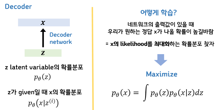 따라서 VAE에서도 우리는 x의 likelihood를 최대화하는 확률분포를 만들고 싶은 것이 목적이 되고,