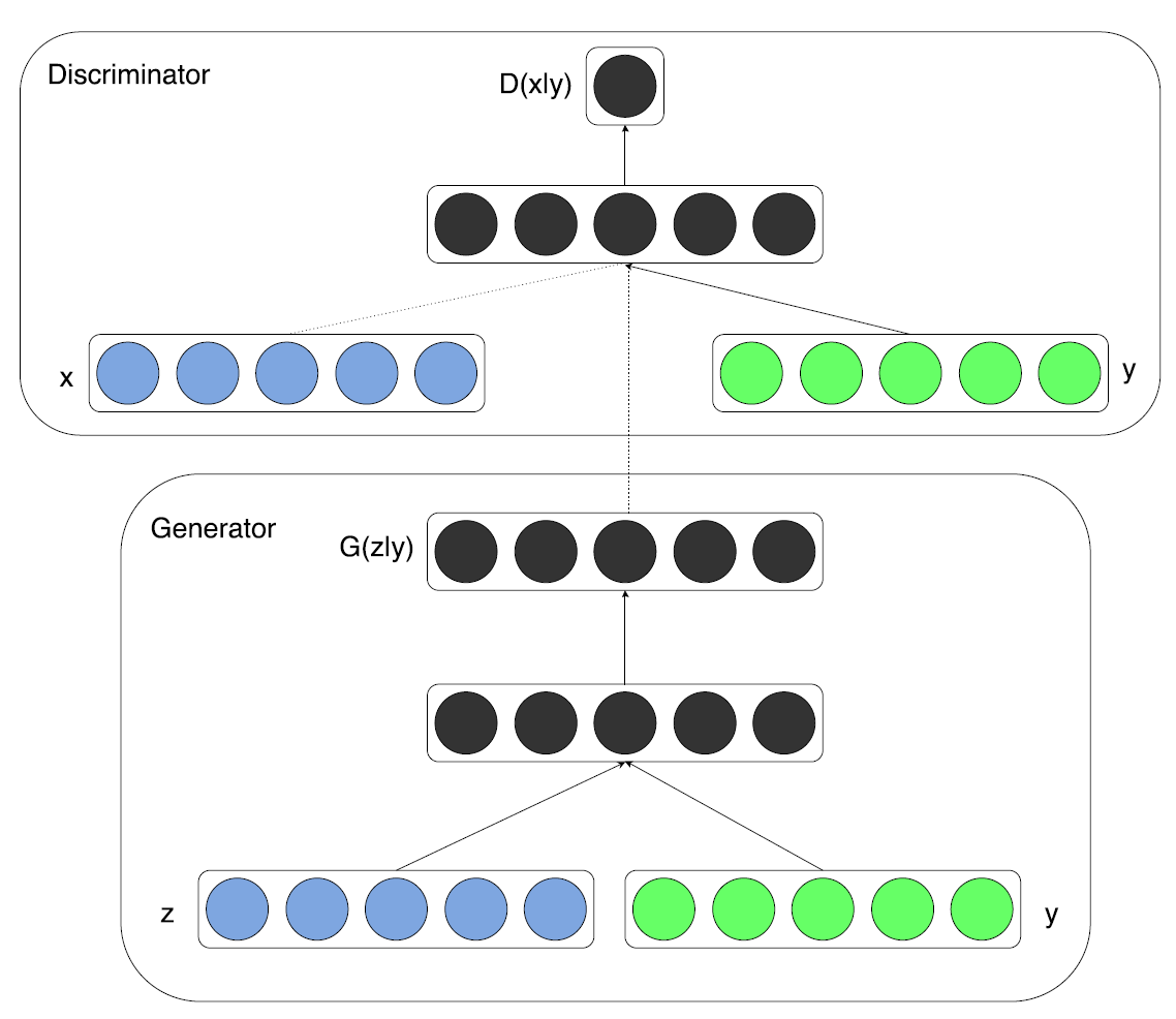 G에서는 input noise인 z와 y가 합쳐진 형태가 들어가게 되고, D에서는 x와 y가 input으로 들어가게 된다.