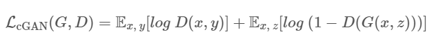 이때 학습 과정은 GAN과 거의 동일하기 때문에 cGAN의 loss function은 다음과 같은 수식으로 표현할 수 있다.