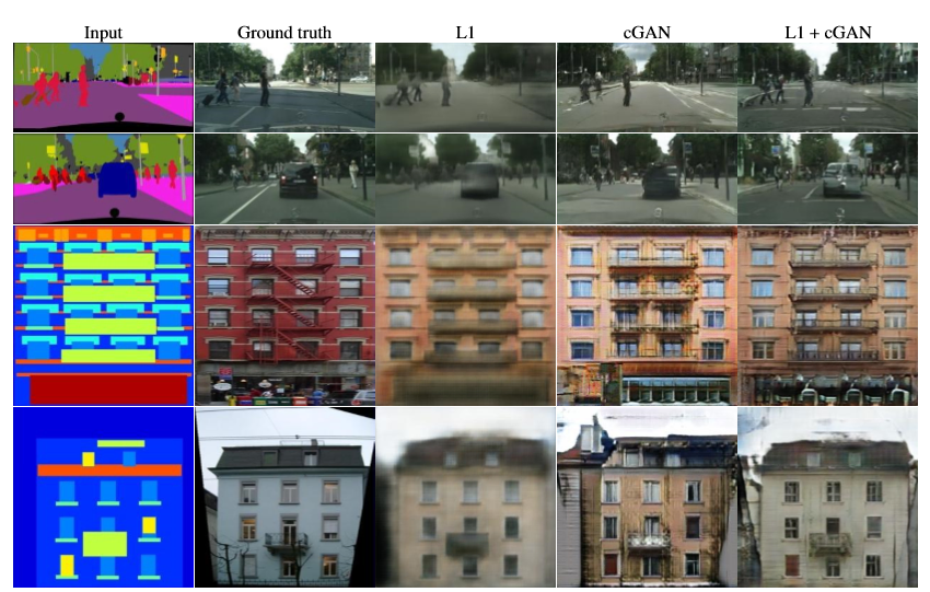 이미지를 통해 확인할 수 있듯이 cGAN과 L1 loss를 모두 사용한 경우가 가장 훌륭한 결과가 나온 것을 알 수 있다!