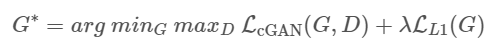 이제 이 두가지를 이용해서 pix2pix의 최종 loss function을 수식으로 정리해보자.